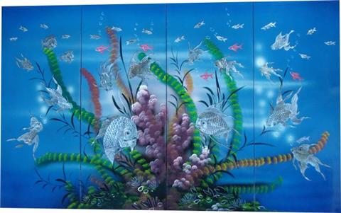 Enjoy the undersea life with this beautiful lacquer painting. Each fish is made of sea shell.